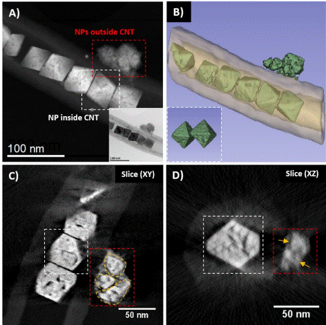 This study explores how carbon nanotube (CNT) confinement affects the formation of cobalt-based nanoparticles (NPs). NPs formed inside CNTs are larger (~50 nm), structurally uniform (Co-CoO), and grow anisotropically, while those on the outer surface are smaller (~20 nm), irregular, and more oxidized (Co₃O₄). In situ TEM shows that NP nucleation differs markedly between environments, with confined synthesis driven by capillary uptake and external growth initiated in vesicle-like solvent domains.