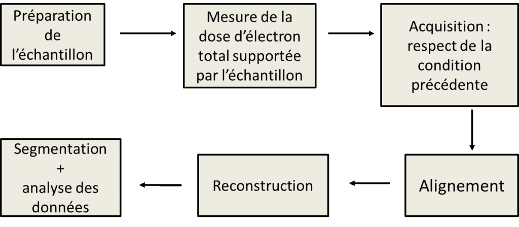 De plus en plus de matériaux synthétisés et étudiés sont à la frontière entre l’organique et l’inorganique, ce qui leur confère de nouvelles propriétés mais entraîne aussi de nouvelles difficultés pour les caractériser. En effet, la microstructure de ces nanomatériaux est de plus en plus complexe. Nous sommes obligés de développer de nouveaux outils pour être capable d’analyser et d’optimiser ces microstructures. D’autre part, la complexité des dispositifs nanométriques ne cessera de croitre jusqu’à obtenir des assemblages composés de plusieurs types de matériaux et dont l’ensemble est maintenu par toutes sortes d’interactions dont les plus faibles. Une technique de choix pour fournir des informations résolues dans les trois directions de l’espace sur ces structures complexes et sensibles est la Cryo-ET. Comme pour la tomographie classique, la reconstruction du volume s’effectue à partir d’une série de projections en deux dimensions (figure 1), la différence étant le fait que les projections sont enregistrées en mode Cryo-EM ; elle permet d’obtenir une résolution inferieure à la dizaine de nanomètres et même en deçà du nanomètre pour les plus résistants au faisceau d’électrons du microscope. Étant donné que la profondeur de champ en microscopie est assez grande et l’échantillon mince, la mise au point s’effectue en première approximation sur toute l’épaisseur de l’échantillon, surtout si l’on travaille en mode parallèle TEM. L’image obtenue est donc une projection de l’échantillon dans un plan perpendiculaire à la direction d’observation. En inclinant l’échantillon à l’aide du goniomètre du microscope à différents angles d’inclinaison (angles de tilt) et en réajustant à chaque reprise la mise au point de la projection, on obtient une série d’images de ce même objet. Puis à partir de cette série on peut réaliser une reconstruction 3D de l’objet à l’aide de différents algorithmes. La résolution finale dans le volume reconstruit dépend essentiellement du nombre de projections acquises et de l’angle de tilt maximum, mais également des caractéristiques de l’objet. Finalement l’analyse du volume consiste à visualiser et extraire les parties à analyser à et calculer les paramètres d’intérêt.