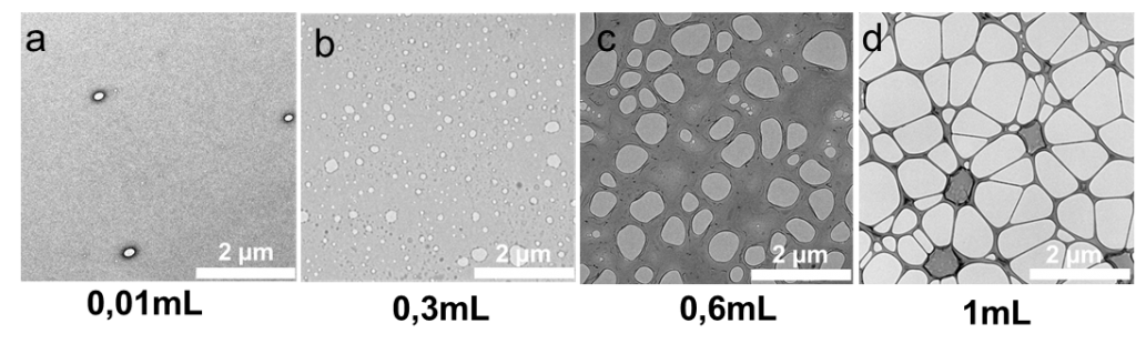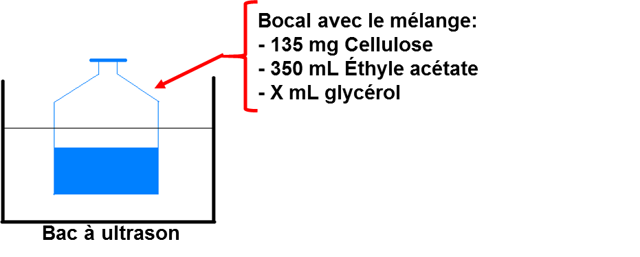 Ce protocole comporte plusieurs étapes, la première étape est la réalisation de solution de cellulose dans l’éthyle d’acétate (figure 1). En effet pour réaliser les trous on introduit du glycérol, car lors de l’étape de dépôt de la membrane de polymère à la surface de l’eau distillée, celui-ci se dissout et génère des trous. Selon le diamètre et la distribution des trous dans la membrane souhaitée, nous varions le volume de glycérol introduit et le temps de macération. Par exemple, pour obtenir des trous entre 0,5 µm et 1 µm on utilise un volume de 0,6 mL de glycérol et nous laissons macérer 6 jours (voir figure 2).