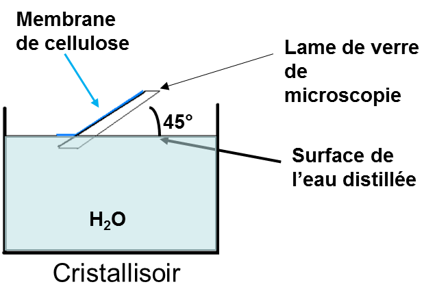 La deuxième étape est l’imprégnation de la lame de verre. On introduit une lame de verre de microscopie dans la solution de cellulose. Elle est laissée une minute immergée dans la solution et puis retirée avec une vitesse de 1cm/s. Après séchage à l’abri de l’air ambiant, la membrane est désolidarisée de la lame en contact avec la surface de l’eau sous un angle de 45° (figure 3).