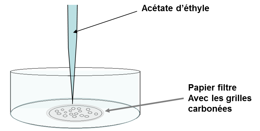 Dans la quatrième et dernière étape on effectue le dépôt d’une couche de carbone de 2 à 50 nm d’épaisseur, par sputtering (plasma) sur la membrane de cellulose percée. Enfin, la couche de carbone est libérée par dissolution à l’acétate d’éthyle de la membrane de cellulose. Cette dissolution s’effectue par dépôt de ces grilles sur une pile de trois filtres et l’acétate d’éthyle ou le chloroforme (selon le polymère) est introduit par infiltration des papiers filtres jusqu’à ils soient totalement imbibés. La manipulation doit être répétée au moins trois fois en changeant chaque fois les filtres (figure 5).